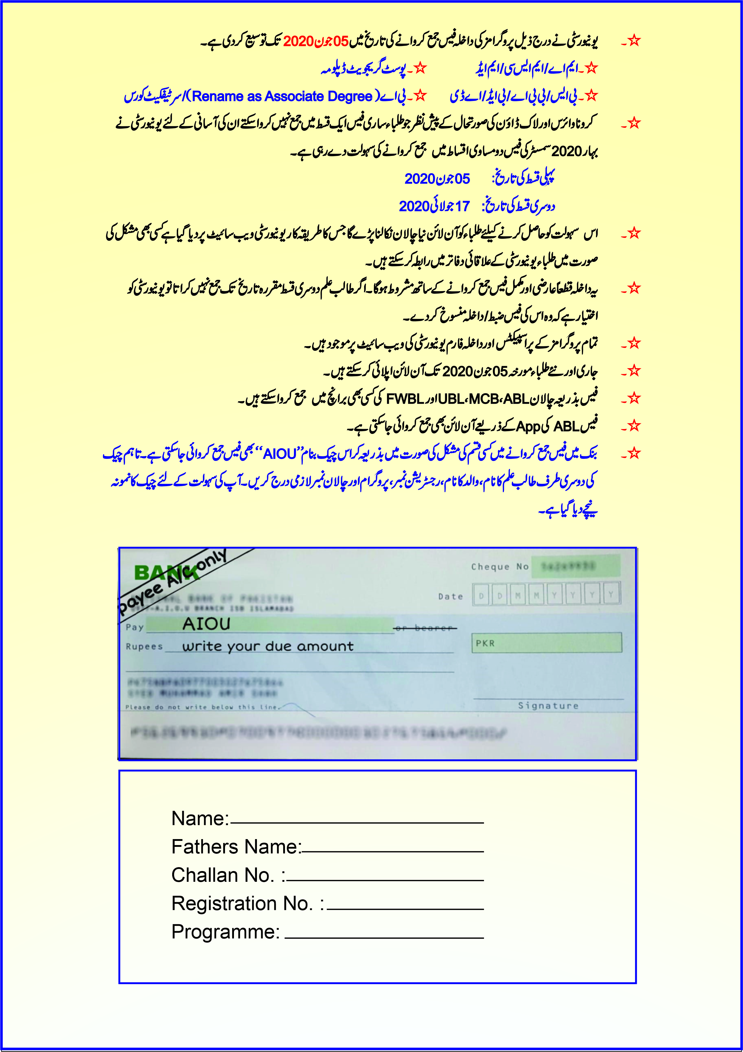 Important Instructions for Admission Fee Submission