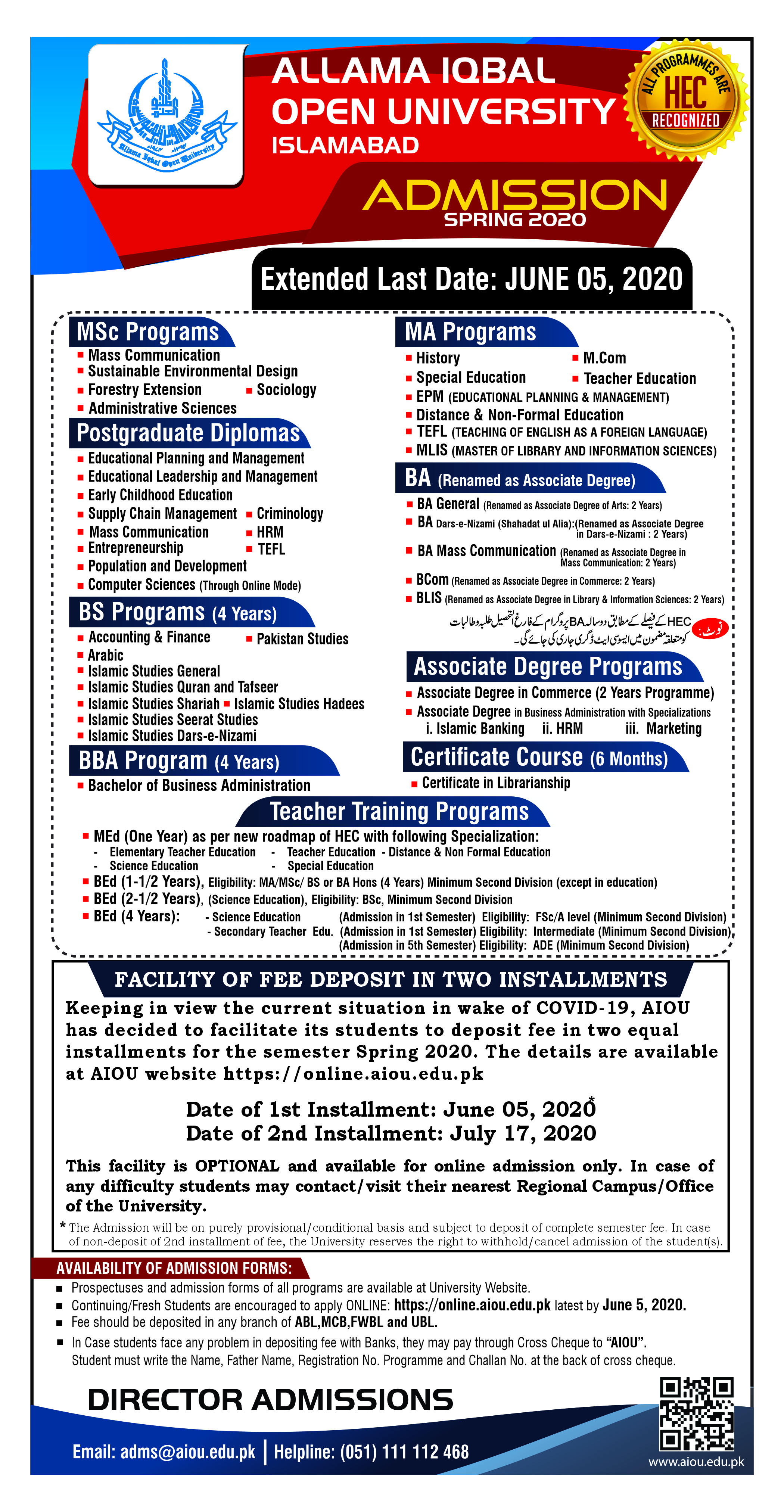 B.A/BBA/BS/ADE/B.Ed/M.Ed/PGD and Post Graduate Programmes (Last Date: 05-June-2020)