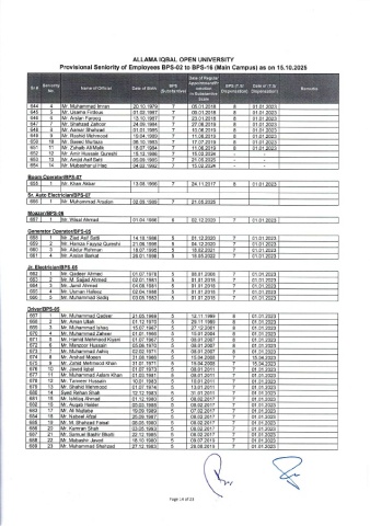Provisional Seniority of Employees BPS-02 to BPS-16 (Main Campus) as on 15.10.2025