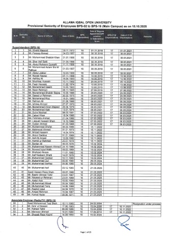 Provisional Seniority of Employees BPS-02 to BPS-16 (Main Campus) as on 15.10.2025