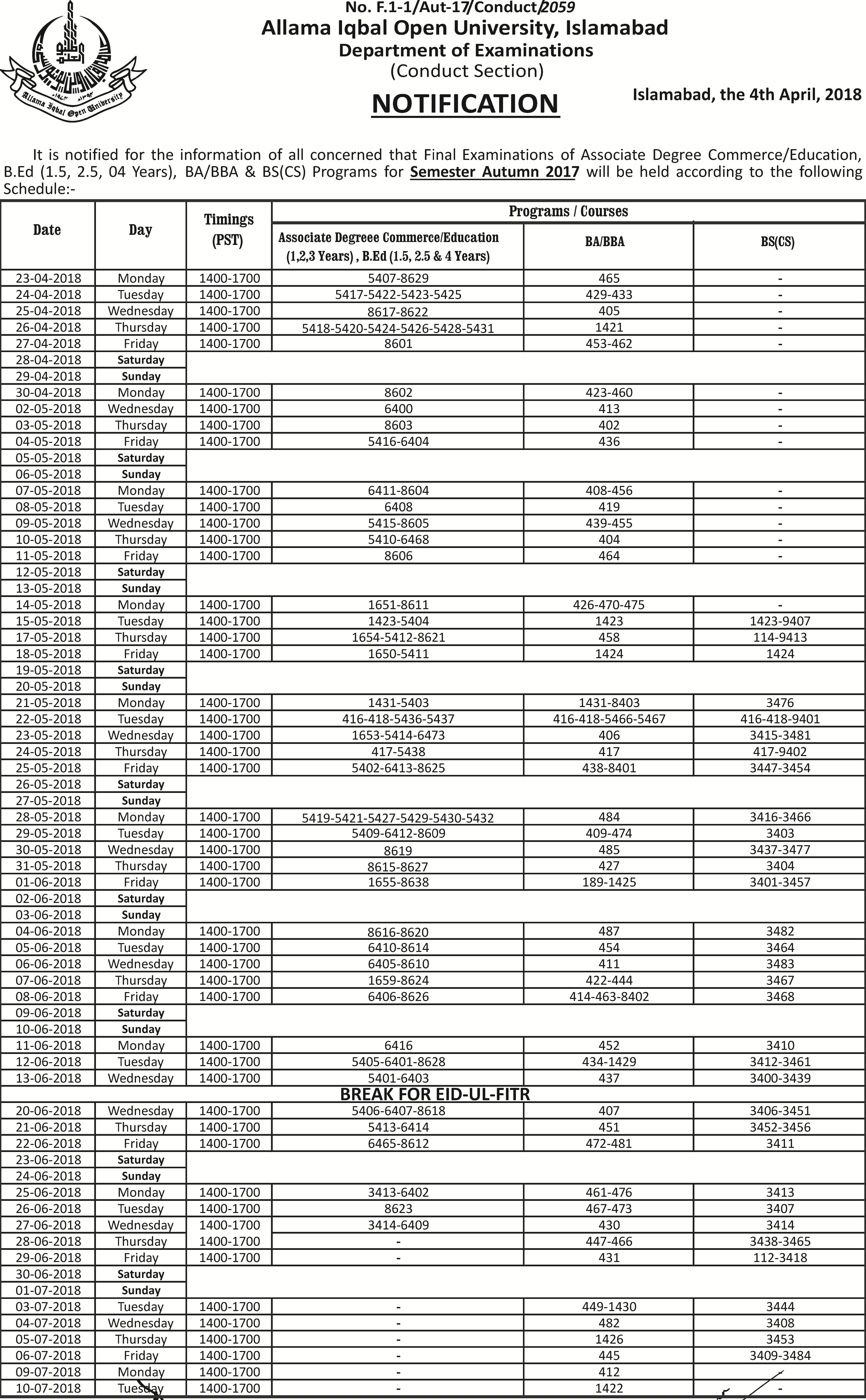 4/5/2018 7:55 PM 6616154 Date Sheet of ADE, ADC, B.ED (New), BA, BBA, BS(CS) Autumn 2017_new.jpg